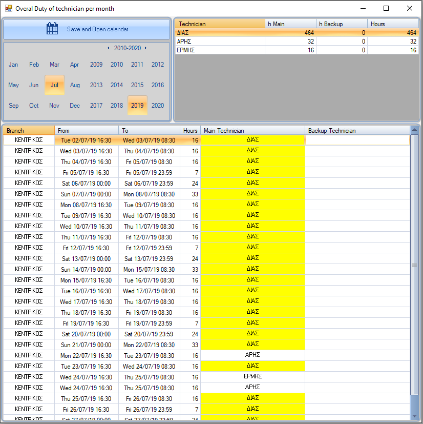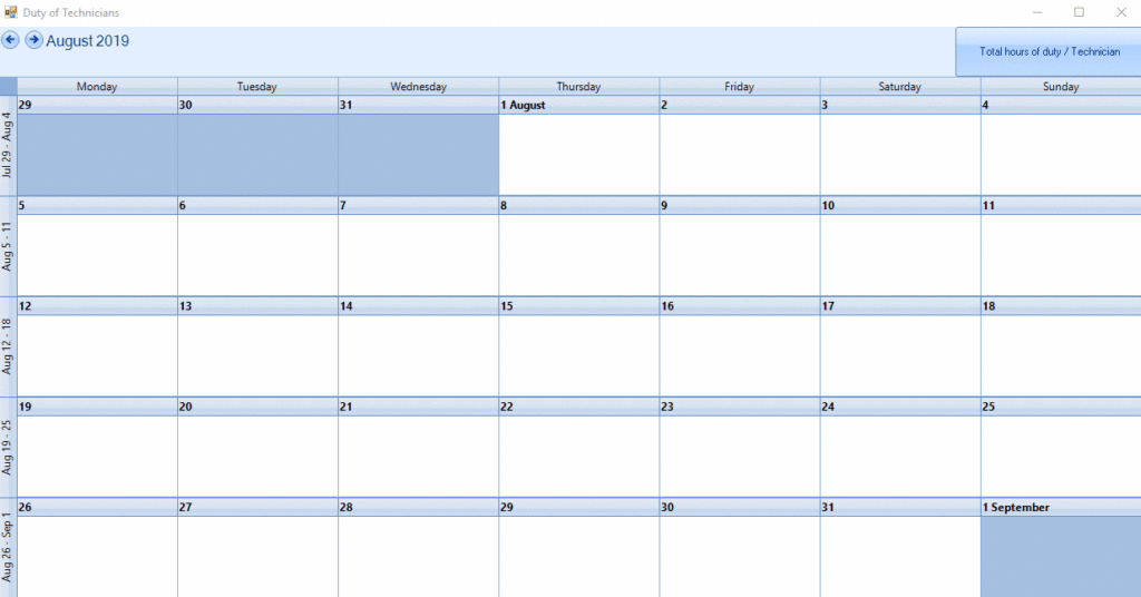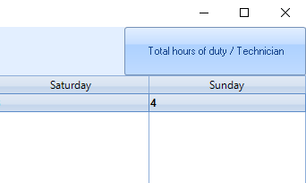 By pressing the button Total hours of duty/ Technician, the form overall duty of techicians per month will show up.