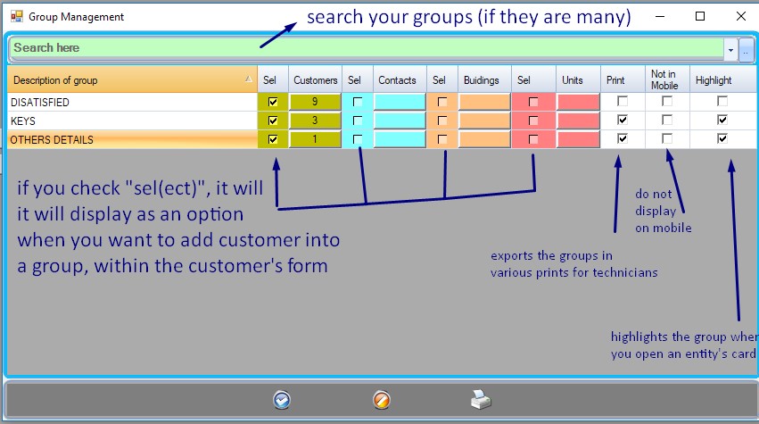 Every group  “sel” checked for its corresponding entity, in the group manager you would be able to add an entity to this group directly from the entity’s form. or remove it from a group