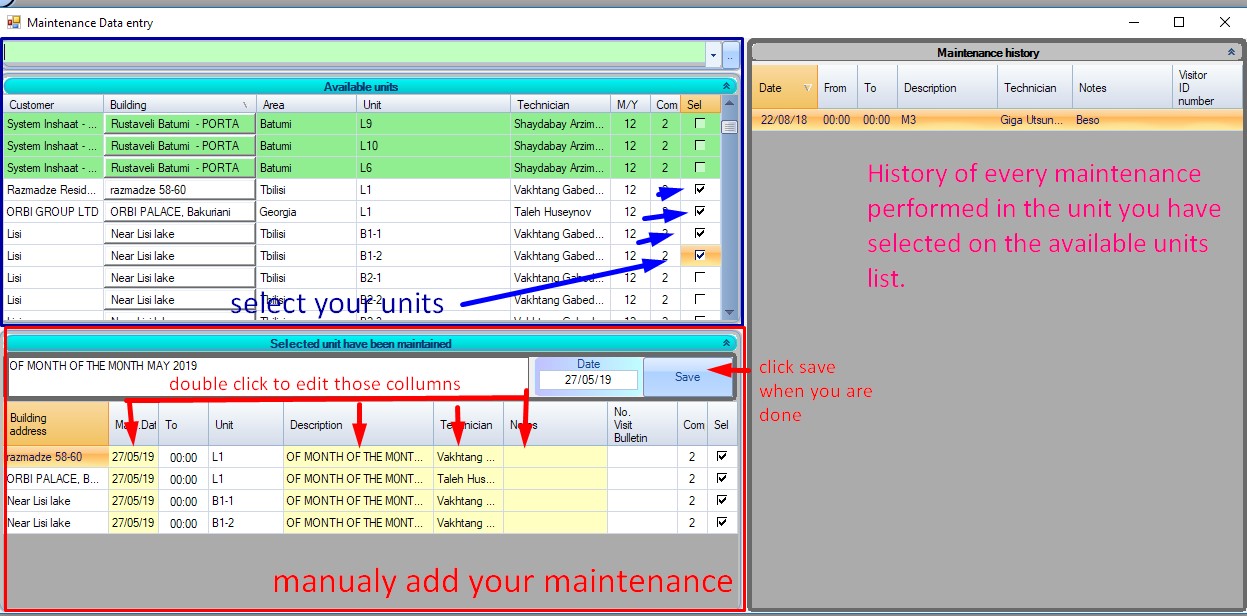 • In the bottom  section you will be able to see your selection and edit various fields, You can also edit the date of the maintenance