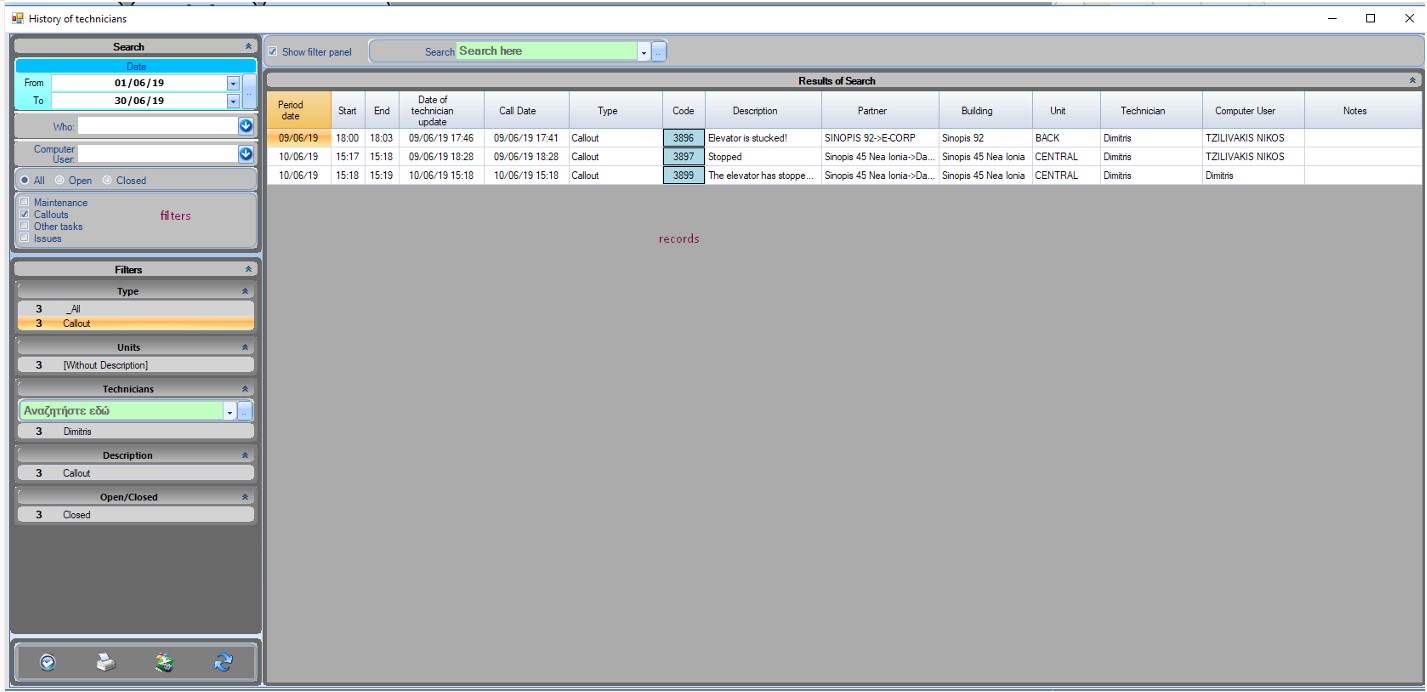 From the technician Action History you can see details about past events that were performed or appointed to technicians. This form works hand by hand with the mobile application but it can also display reports when events are inserted manually. By using the filters you can see records of: