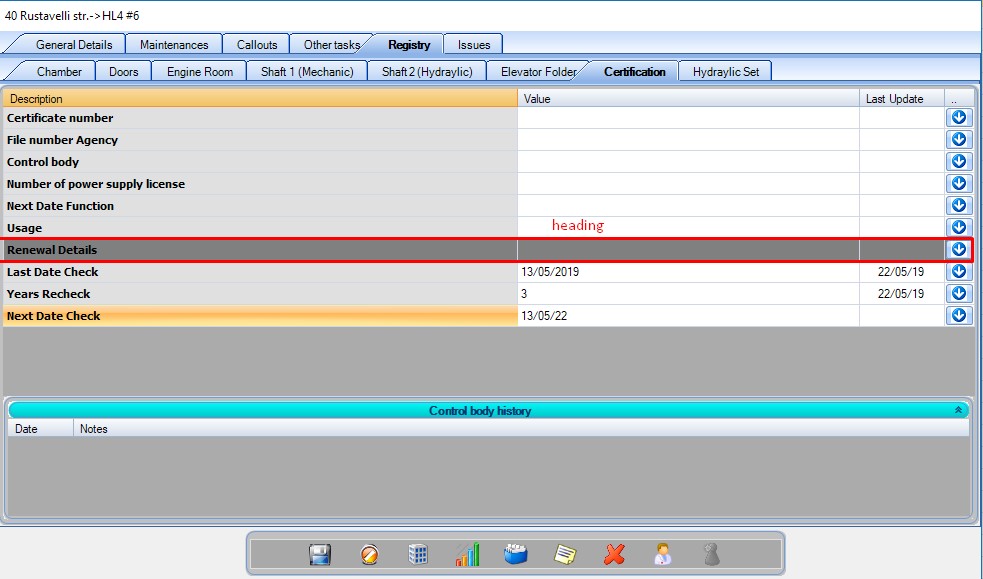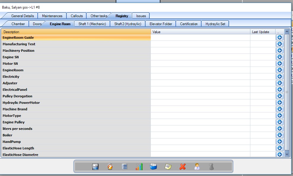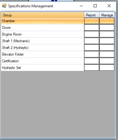 From here you can edit the parents of your specifications. Essentially it will contain the various physical parts of your elevators, or other characteristics like Certifications etc. The parts of the specification may contain other fields,