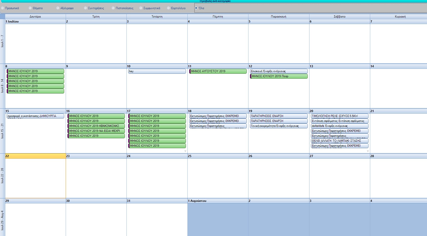 Μπορείτε να φιλτράρετε τα συμβάντα με βάση την κατηγορία τους από το πάνω μέρος της φόρμας.