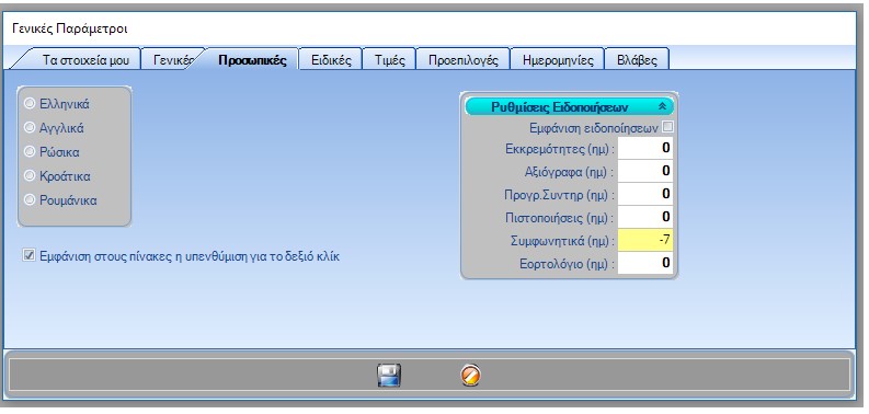 Στις προσωπικές ρυθμίσεις μπορείτε για κάθε τύπο ειδοποίησης να ρυθμίσετε το πότε θα σας εμφανιστεί. Για παράδειγμα, μπορείτε να ρυθμίσετε να ενημερώνεστε για πιστοποιητικά που είναι έτοιμα να λήξουν 7 μέρες πριν.
