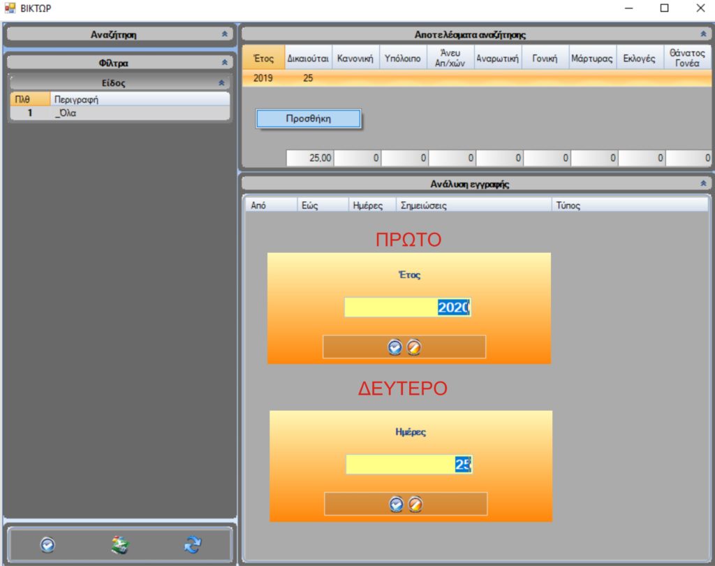 - Στην συνέχεια πατάτε δεξί κλικ μέσα στο πεδίο “Αποτελέσματα αναζήτησης” (βλέπετε Εικόνα 3 )και πατάτε Προσθήκη αυτό σας ανοίγει πρώτα το έτος (βλέπετε Εικόνα 3 ΠΡΩΤΟ) του δίνετε το έτος που θέλετε, πατάτε ΟΚ Έπειτα στο δεύτερο παράθυρο (βλέπετε Εικόνα 3 ΔΕΥΤΕΡΟ) του δίνετε της συνολικές ημέρες άδειας που δικαιούται ο υπάλληλος αυτός στο έτος που επιλέξατε και πατάτε πάλι ΟΚ.