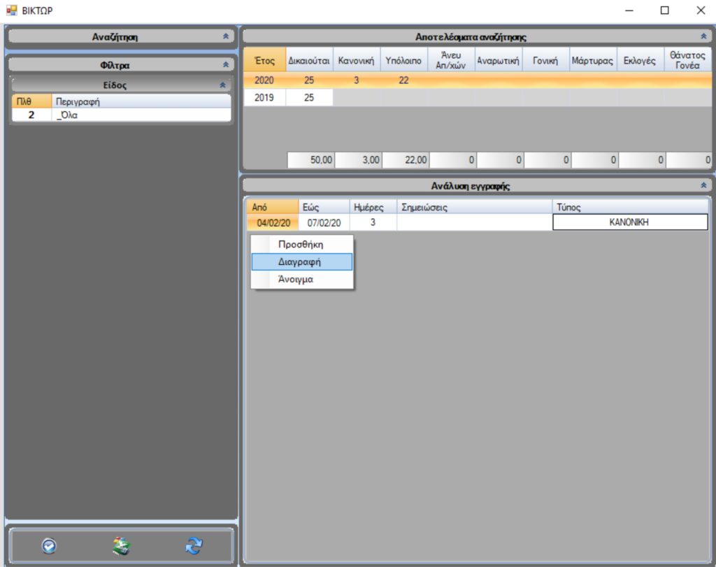 Στην φόρμα αυτή στην περιοχή της “Ανάλυσης εγγραφής” μπορείτε επίσης να διαγράψετε και άδειες που έχετε περάσει πατώντας δεξί κλικ πάνω στην περασμένη άδεια μέσα στη φόρμα αυτή (βλέπετε Εικόνα 6).