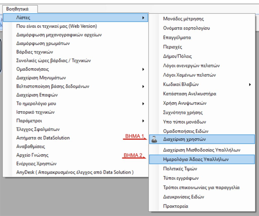 - Για να περάσετε μια άδεια σε έναν υπάλληλο ακολουθείται την παρακάτω διαδρομή στο μενού: (Βοηθητικά => Λίστες => Διαχείριση χρηστών) ( βλέπετε Εικόνα 1 Βήμα 1) αυτό σας πηγαίνει στην καρτέλα της “διαχείριση χρηστών” (εικόνα 2)