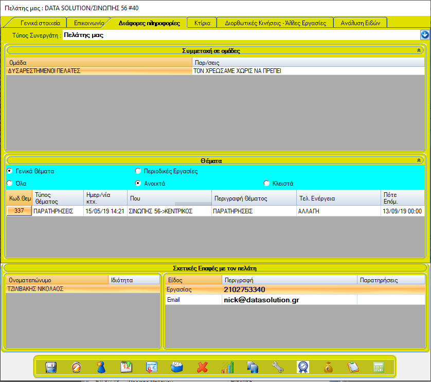 Από τις διάφορες πληροφορίες μπορείτε να επεξεργαστείτε τις ομάδες και τα ανοιχτά θέματα του πελάτη. Μπορείτε επίσης να προσθέσετε καινούργια κάνοντας δεξί κλικ στον αντίστοιχο πίνακα.