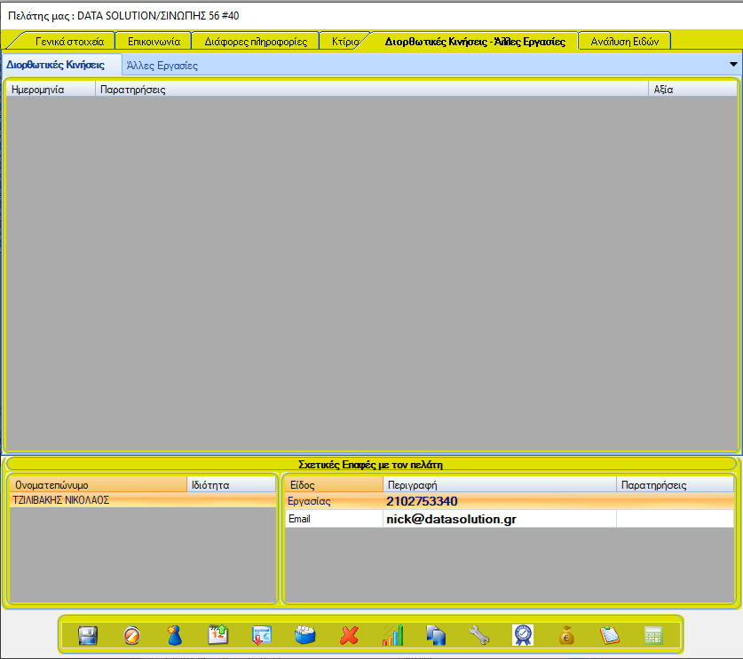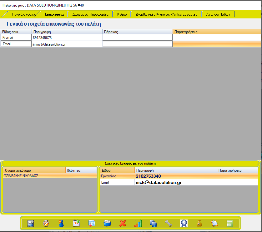 Σε αυτήν την καρτέλα υπάρχουν γενικές πληροφορίες επικοινωνίας της εταιρείας του πελάτη. Μπορείτε να προσθέσετε καινούργιες επαφές κάνοντας δεξί κλικ στον πάνω πίνακα. Οι σχετικές επαφές είναι ανεξάρτητες με τα στοιχεία επικοινωνίας του πάνω πίνακα.