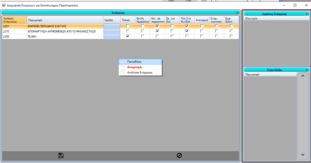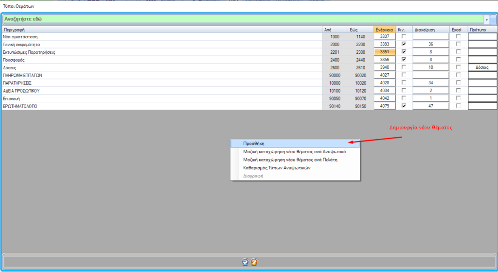 Έπειτα πρέπει να προσθέσουμε εκτυπώσιμες ενέργειες και μια τελική ενέργεια. Σας προτείνουμε να δημιουργείτε ενέργειες με τους τίτλους των διαφόρων τύπων σημειώσεων που θα θέλατε να έχετε. Για να δημιουργήσετε ενέργεια πατάτε δεξί κλικ στον πίνακα και έπειτα προσθήκη.  Είναι σημαντικό να τσεκάρετε το “Εκτ. σε παραστατικό”. Εάν επιλέξετε το όχι στο κινητό το θέμα, δεν θα εμφανίζεται στα κινητά των τεχνικών, άρα δεν θα μπορούν και να το κλείσουν.