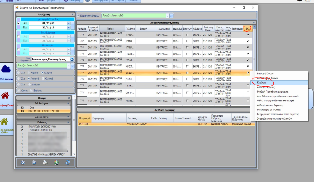 Επιλέξτε τα θέματα που θέλετε και μετά δεξί κλικ στην στήλη αυτή και επιλέξτε Κλείσιμο. Μπορείτε να φιλτράρετε τα θέματα με βάση τον πελάτη, ενέργεια κλπ από τα φίλτρα αριστερά.