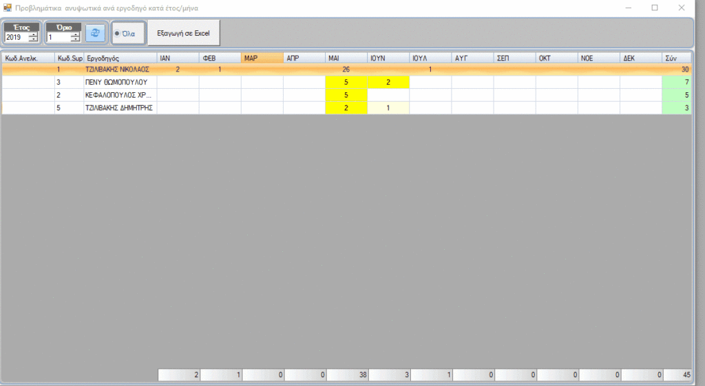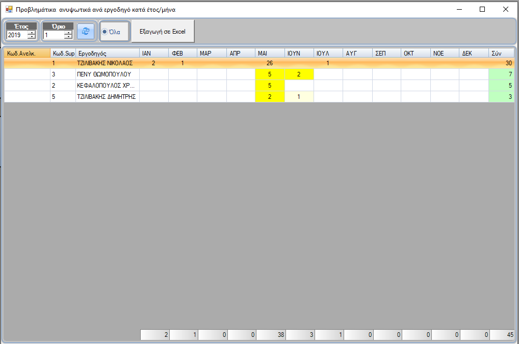 Οι αριθμοί στις στήλες των μηνών εμφανίζουν πόσες βλάβες έγιναν τον αντίστοιχο μήνα, σε ανελκυστήρες που ο εργοδηγός ήταν υπεύθυνος.